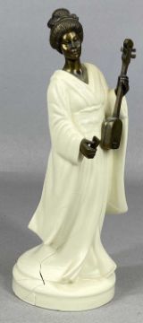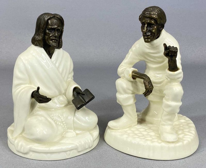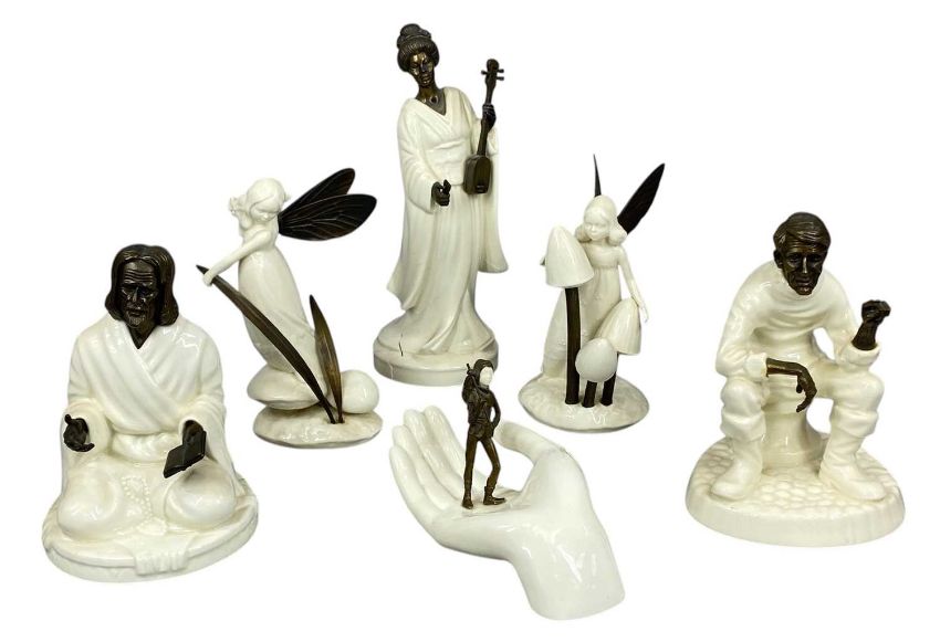 SIX MINTON CHINA & BRONZE FIGURINES, 'The Sage', 'Traveller's Tales', 'Geisha', 'Cowslip', 'Meadowsweet', and 'Tom Thumb'