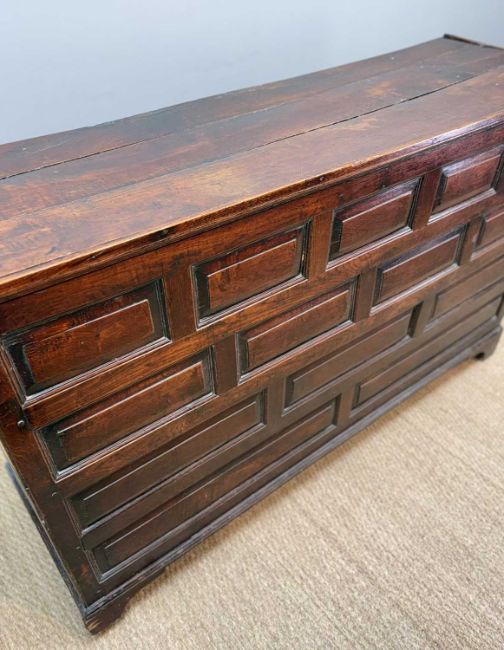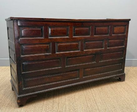 LARGE 18TH CENTURY WELSH JOINED OAK PANELLED COFFER, possibly Merionethshire, strut hinged triple-plank lid, multi-panelled front and sides, storage interior full depth, interior rear and lid lined with newspaper dating 1875/77, raised on bracket feet, 103 (h) x 175 (w) x 55cms (d)