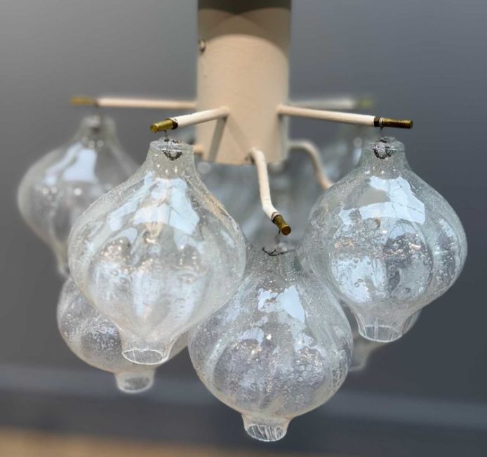 MCM J. T. KALMAR FOR FRANKEN 'TULIPAN' GLOBE CHANDELIERS, produced in collaboration with Murano featuring hand-blown 'bubbled' glass 'onions' suspended by brass screw, double-loop split ring and/or chains to central support, one larger 25 globe chandelier, 32 (drop) x 40cms (w), single 110w bulb central fixing, two 10 globe chandeliers, approx. 27 (drop) x 27cms (w), single central 110w bulb central fixing, together with an additional 29 spare glass onions (without fixings)