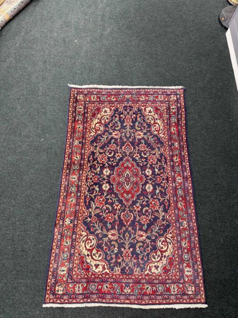 HAMADAN WOOLLEN RUG, late 20th century, blue field centred with a red medallion, 190 x 113cms
