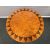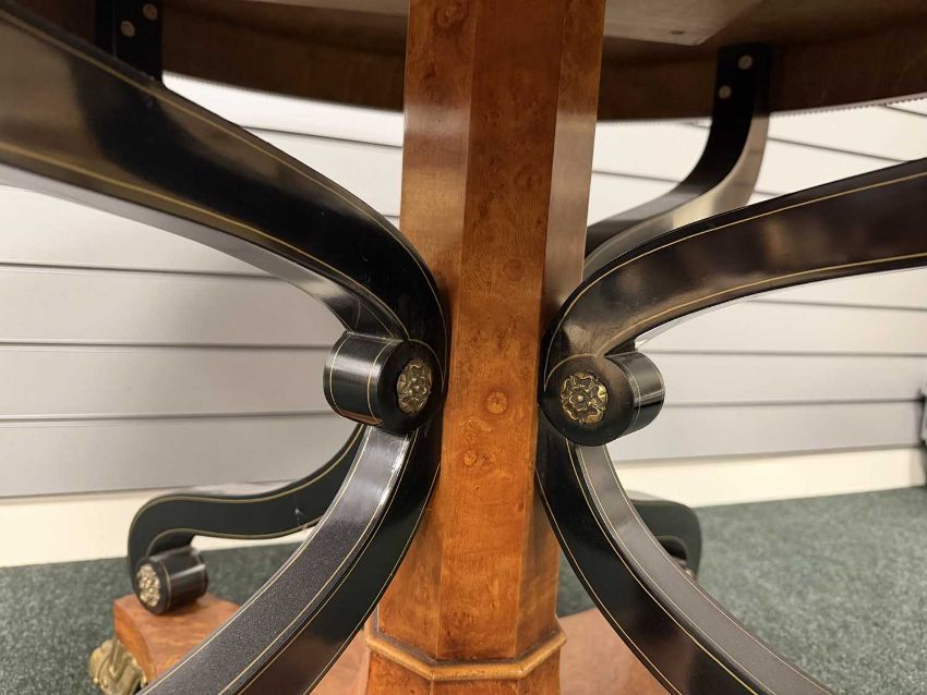 EMPIRE STYLE CENTRE TABLE, the circular top having a geometrically inlaid design in exotic veneers, hexagonal centre column, ebonised scroll supports to the square base, with concave sides and on gilded paw feet, size 70 (h) x 97cms (diam.)