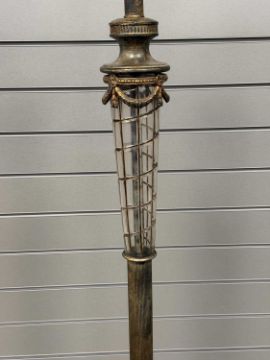 STANDARD LAMP, metal and glass with antique effect finish, square base, 154cms (h) to fitting; with a gilt and onyx standard lamp, circular base, 164cms (h) to fitting, both having cream fabric shades (2)