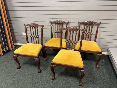 GOOD QUALITY REPRODUCTION MAHOGANY DINING FURNITURE, twin pedestal table with carved supports, three centre leaves, approx. 76 (h) x 437 (l) x 124cms (w) (extended); bow-front sideboard, inlaid doors, centre drawer with lion mask ring handles, fluted turned supports, 98 (h) x 182 (l) x 62cms (d); and twelve mixed Chippendale style dining chairs, stuff-over upholstered seats, and carved cabriole claw and ball frontal supports, 97cms (h) (14)