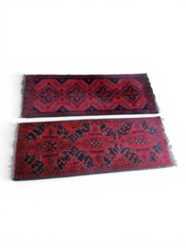 TWO AFGHAN MOHAMMADI RUNNERS, red and black ground, each 148 x 54cms (2)