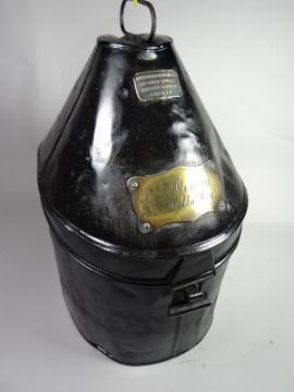 A painted black metal helmet box by Hamburger Rogers & Co., King St. Covent Garden with brass identity plate inscribed to 'P.J. Rowan, 3rd Wilts. Regt.'