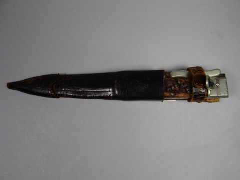 A heavy quality folding hunting knife with stag horn grip and white metal mounts and shaped blade housed in bespoke and buttoned leather scabbard