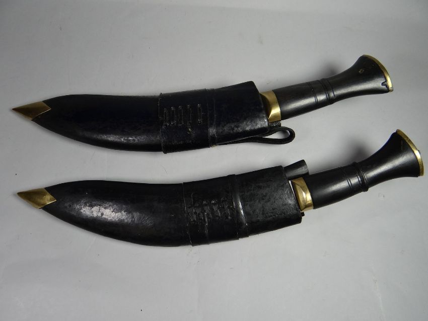 A pair of military-style Nepalese kukries in black leather and brass-tipped scabbards