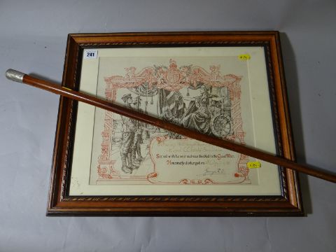 A Royal Welsh Fusiliers regimental cane together with a framed Certificate of Discharge to Pte. George Green Mainwaring, R.W.F.