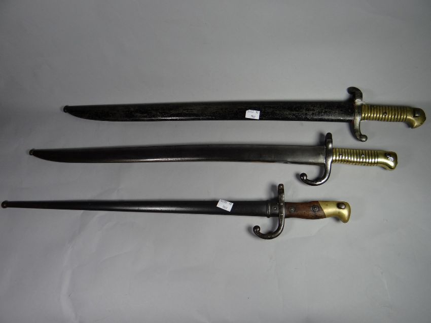 A French 1842 pattern bayonet together with a French Lebel bayonet with matching numbers and another similar