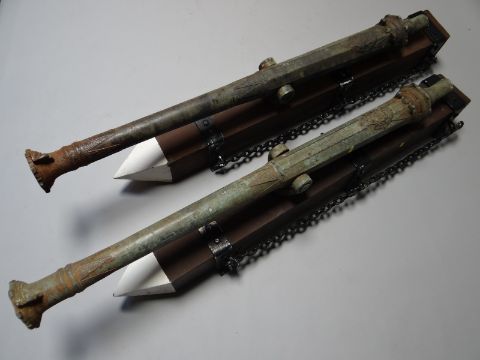 A matching pair of early nineteenth century bronze Lantaka Cannon with Arabic Royal cipher on Balau hardwood and metal mounts with painted black drag chains