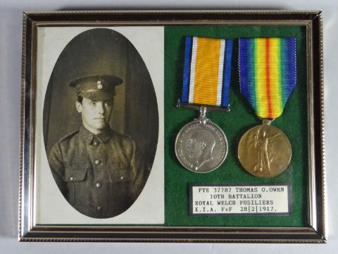 A framed WWI pair of War & Victory Medals to 37787 Pte. Thomas O. Owen, 10th Bn. R.W.F. together with original photograph, who was killed on 28/02/17