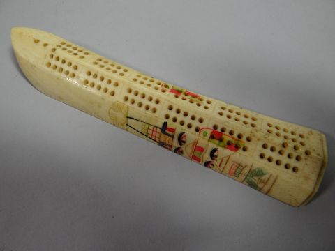 A scrimhaw cribbage counter with painted native patterning and moving peg base, 6 ins (15 cms) long