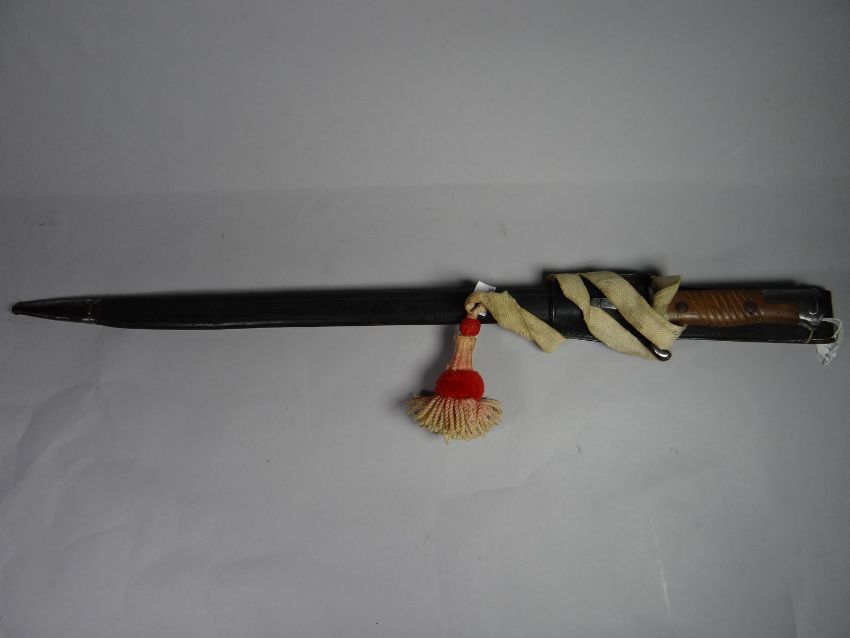 A German thin bayonet with blade marked 'FrFurt' and wooden wrap-around grip, frog and portepee knot