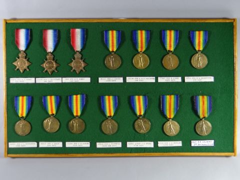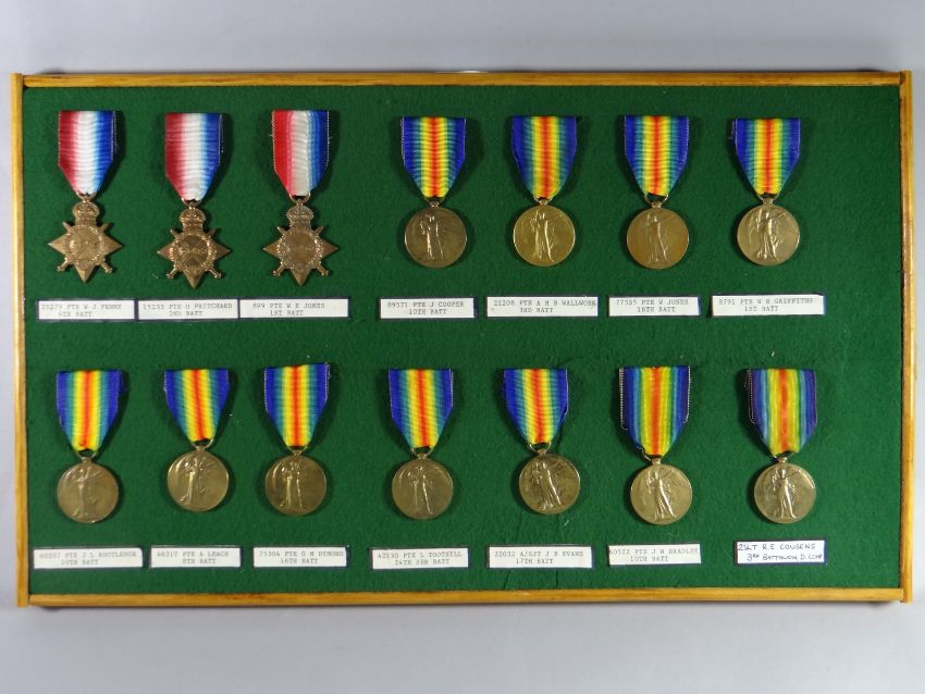 A framed collection of WWI Medals consisting of eleven Victory Medals and three 1914-15 Star Medals (full list available on request)