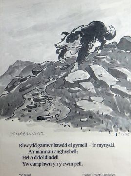 SIR KYFFIN WILLIAMS RA limited edition (40/75) print - sheepdog on a mountain with a four line poem 'Y Ci Defaid' (The Sheepdog) by Thomas Richards, Llanfrothen, signed in full, 23 x 15.75 ins (58 x 40 cms)
