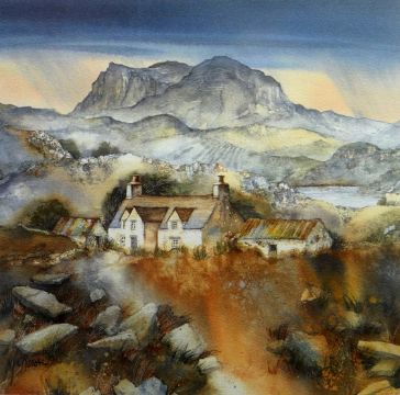GILLIAN McDONALD limited edition (538/850) print - farmhouse with lake and mountains in background, entitled 'Stone Farm IV', signed, 11 x 11 ins (27 x 27 cms)