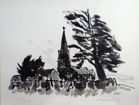 SIR KYFFIN WILLIAMS RA limited edition (144/250) prints a pair - signed and initialled, 1) Llanedwen Church By Night, 10 x 13 ins (25 x 33 cms), 2) Llanedwen Church By Day, 10 x 13 ins (25 x 33 cms)