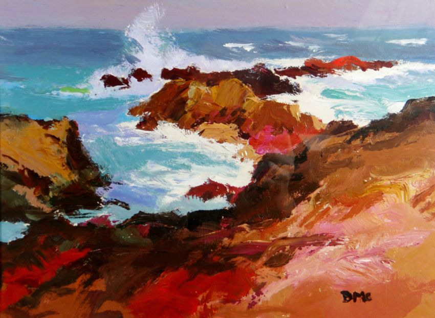 DONALD McINTYRE acrylic - waves breaking onto rocks, Attic Gallery label verso with title 'Surf and Rocks, no. 9', signed with initials, 11.5 x 15.5 ins (29 x 39 ins)