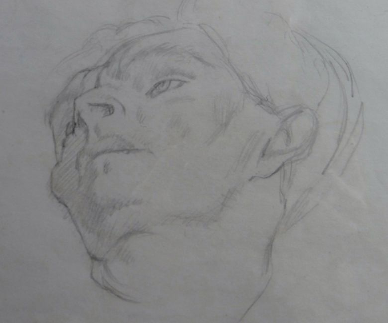 MILDRED ELDRIDGE pencil study - head portrait of the poet and preacher R.S. Thomas looking upwards, signed, 8 x 9.5 ins (20 x 24 cms) (bearing well presented R.S. Thomas poem verso entitled 'A Marriage') (Provenance: purchased by the current vendor from Abbott and Holder in 1998 who obtained it from the artists family)