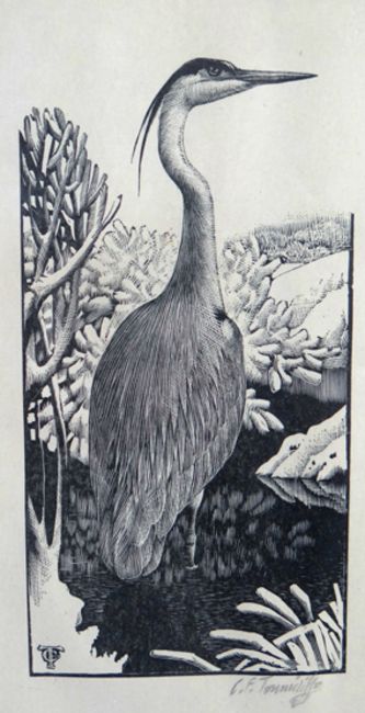 CHARLES FREDERICK TUNNICLIFFE three woodcuts - ornithological studies of an owl, a heron and a songbird, each signed fully in pencil, 6 x 4 ins (3 x 10 cms), 6 x 3 in (15 x 8 cms), 7 x 5 ins (17 x 12 cms)