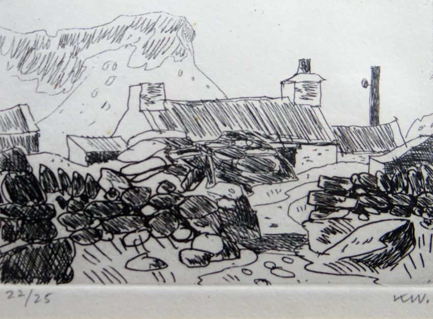 SIR KYFFIN WILLIAMS RA limited edition (22/25) print - cottage roof above dry-stone wall, signed with initials, 5 x 7 ins (12 x 17 cms)