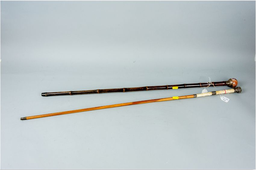 Two Victorian silver mounted walking sticks, Chester hallmark bowl topped cane containing a Cairngorm ball, the other with two knobbly carved ivory sections and Birmingham silver mounts, 35 and 37 ins respectively (89 and 94 cms)