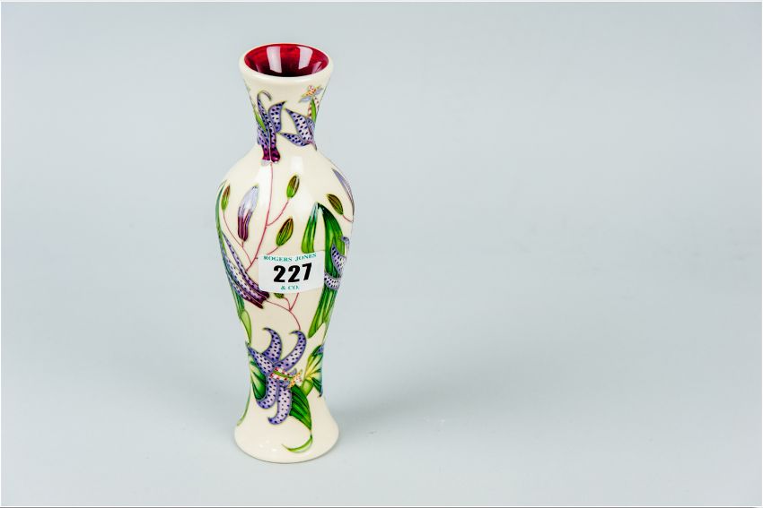 A slender Moorcroft cream ground vase having a raised orchid pattern, 8 ins (20.25 cms)