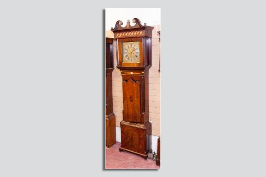 A good quality mahogany longcase clock having a square brass dial with silvered Roman numeral chaptering with subsidiary seconds, date aperture, maker's name 'Thomas Houghton', pierced brass cherub's head quarter spandrels set before a twin weight driven movement striking on a bell, the hood with twin swan neck pediment above a blind fretwork frieze, single glazed door flanked by reeded pillar columns, inlaid trunk with single shaped top door, Sheraton style inlaid cartouche flanked by quarter cut reeded columns on a stepped square base on four corner feet, pendulum etc included, 89 x 20.5 ins (226 x 52 cms)