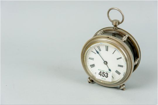 A well made single fusee maritime clock in a silvered metal case having faceted dial glass cover, white Roman numeral enamelled dial, front and rear separated by turned metal pillars with full surround glass movement cover, the brass backplate stamped 'Brevete, Paris' on turned metal bun feet with metal ring carrying handle, 6 ins (15 cms) to top of handle x 4.5 ins (11.5 cms)