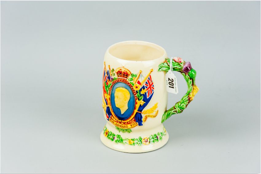 A Crown Devon Fieldings commemorative musical tankard showing Edward VIII's Coronation and Abdication, 6.25 x 6.25 ins (16 x 16 cms), (overall crackle to the glaze and some interior staining)