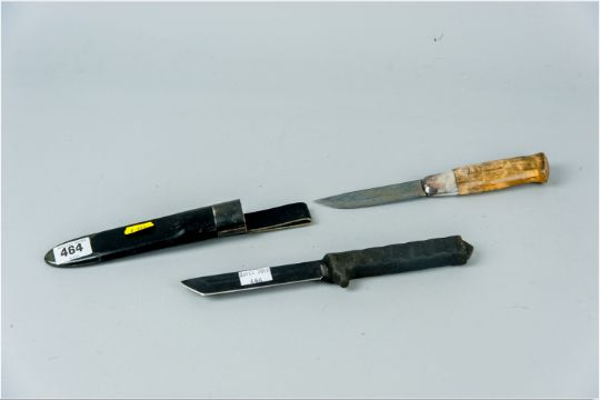 A David Andersen, Norway hunting knife in a sheath with Norwegian sterling silver collars and a Scale Mead stainless steel Japanese hunting knife with rubber grip