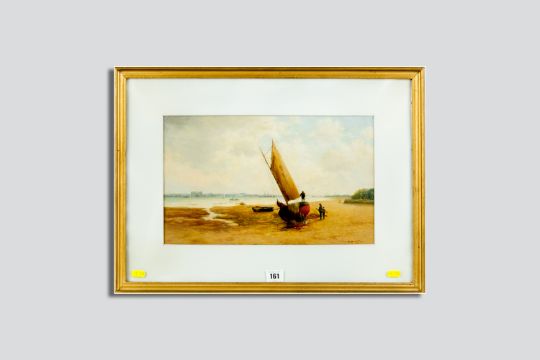 FRANK RAWLINGS OFFER oil on board - beached boat with figures and distant ports with numerous vessels, signed, 9.5 x 15.5 ins (25 x 39 cms)
