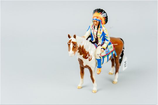 A Beswick Indian Chief on horseback, the Chief in brightly coloured clothing and headgear, seated upon a brown and white pony (chips to both ears, broken and re-glued leg on pony), 9 x 9 ins (23 x 23 cms)