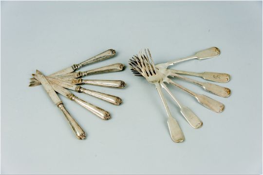 Six mixed fiddle patterned silver dessert forks, 9 ozs and six silver handled fruit knives
