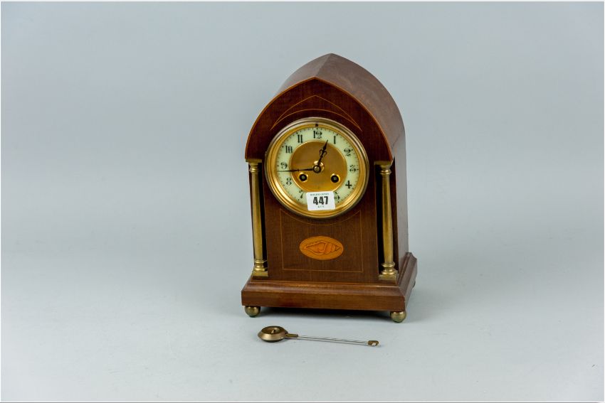 A nice quality mahogany dome topped mantel clock with pendulum, the mahogany case line inlaid with a Sheraton style shell oval panel to the front, flanked by twin turned brass pillars, enamelled ring dial and gilt decorated bezel and winding plate, set upon four brass bun feet, twin winding holes with a hammer striking coil to chime, 11.5 x 8 ins (29 x 20.25 cms)