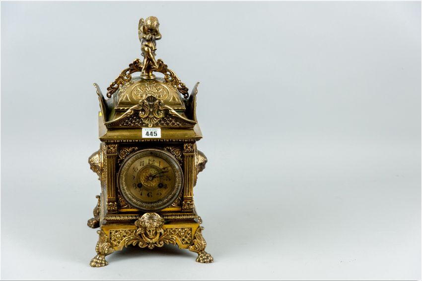A late 19th Century French brass mantel clock, profusely decorated square case, silvered dial (worn), behind a bevelled bezel, winged masks of maidens either side, the top surmounted with a winged cherub blowing a horn, caryatid head below the dial surmounted on acanthus leaf corners and lion's paw feet, 'Japy Freres' maker's mark, 17 x 9 ins (43 x 23 cms)