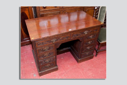 An ornately carved twin pedestal desk, oak top over twin drawers with twin banks of four drawers to each side and shaped footwell, the drawers having pierced brass backplates with swing handles, panel sided on a carved plinth base, 42.5 ins (108 cms) wide