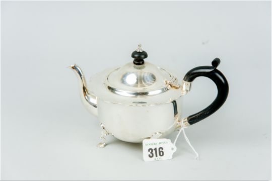 A plain circular silver bachelor teapot on four web supports with composition handle and knop, 8.5 ozs gross, Chester 1907