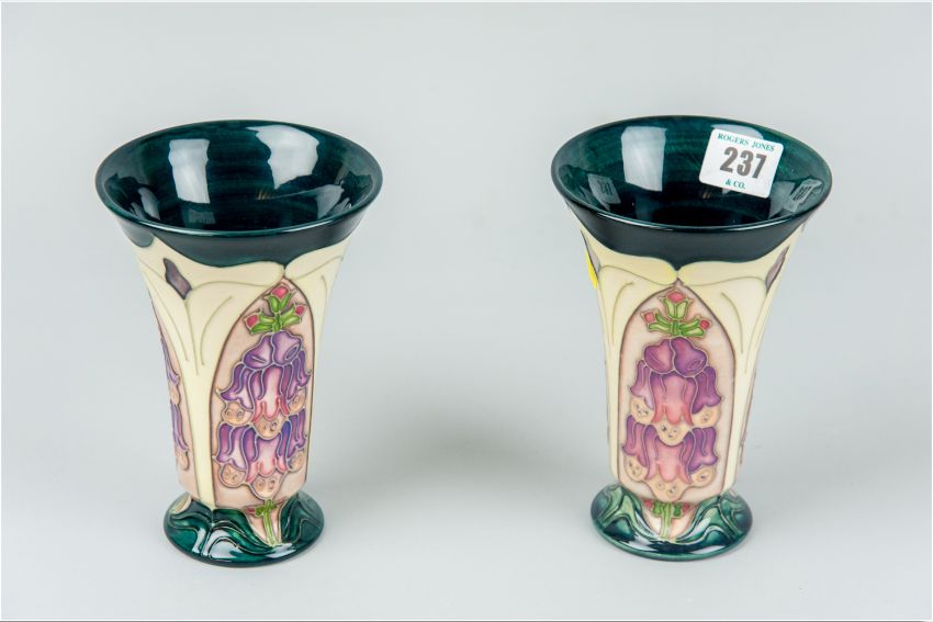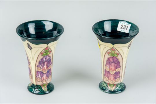 A pair of Moorcroft trumpet shaped vases, tube lined decorated in the 'Foxglove' pattern, deep blue green interior, cream ground wavy panels to the exterior and three arched panels of foxgloves, 6 x 4.25 ins (15.25 x 11 cms), (crackling to the glaze, two small bubble imperfections to glaze), impressed marks etc in green and blue to the bases
