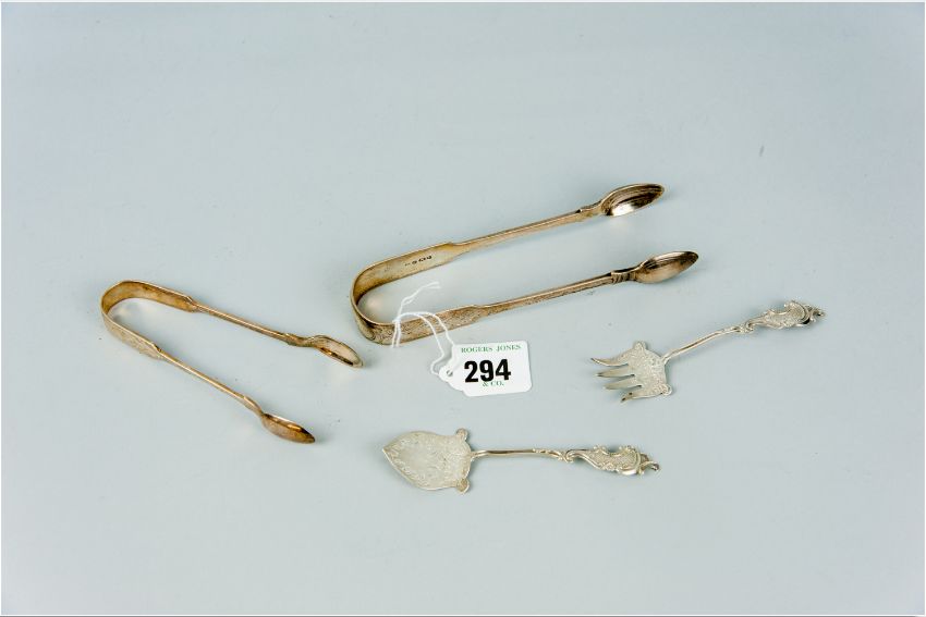 A bright cut pair of silver sugar tongs, 2.7 ozs, another pair and a bright cut jam spoon and fork with scrolled handle, total 3 ozs