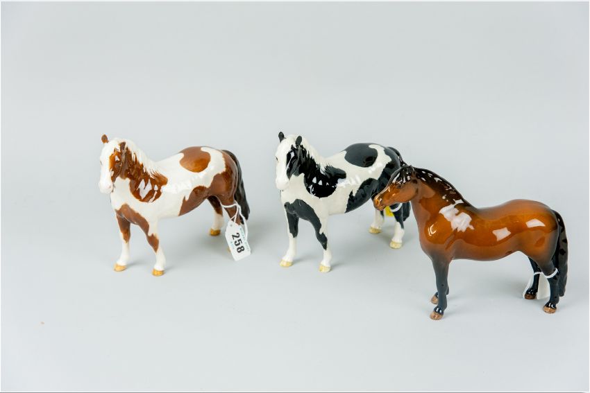 A Beswick brown Dartmoor pony (chips), a Beswick brown and white pinto pony (loss to one ear) and a black and white pinto pony, 7 x 7 ins (18 x 18 cms)