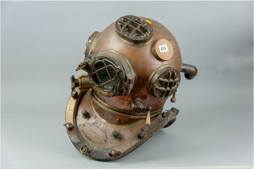 A US Navy deep sea copper and brass diving helmet having a plaque on the breastplate 'US Navy Diving Helmet, Mark V, Morse Diving Equipment Company Inc, Boston, Mass' and date stamped 8-29-41, 19 x 14 ins (48.5 x 35.5 cms)