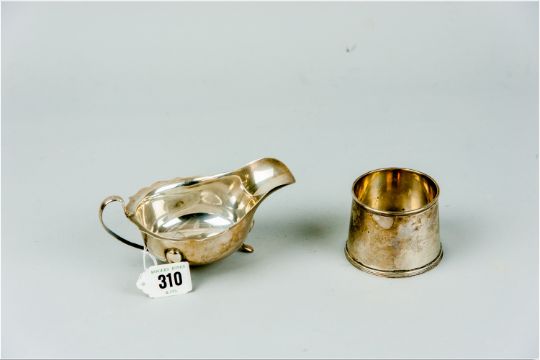 A plain silver sauce boat on three hoof supports, 3.3 ozs, Sheffield 1959 and a circular plain silver bowl of slightly tapered form, 3.2 ozs, Birmingham 1920