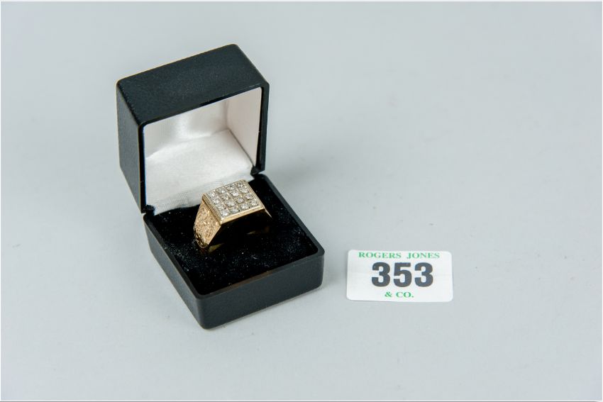 A gent's nine carat gold signet ring with sixteen pavé set diamonds in a square top, size 'V', 10 grms gross