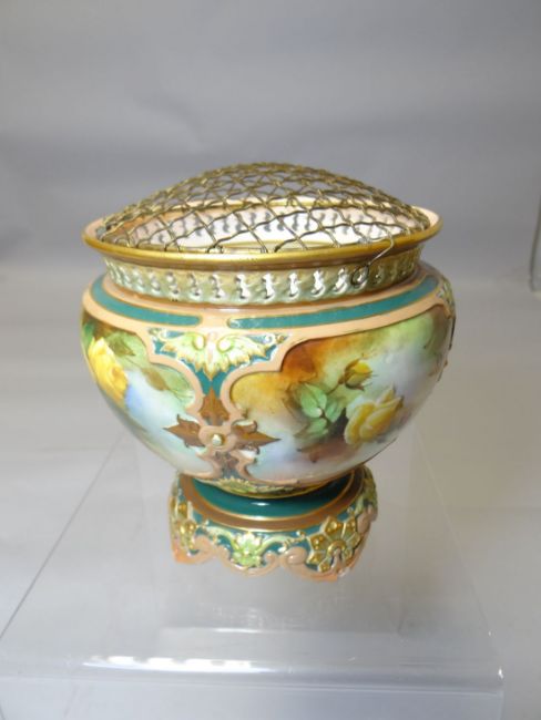 A Royal Worcester porcelain footed rose bowl decorated with four panels of roses surrounded by raised floral design and motifs by James Hadley and having pierced neck, datemark for 1907, 6 ins high (15 cms) (small chip to foot)