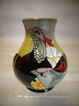 A Moorcroft pottery ovoid vase in the 'Courting Birds' pattern, 6 ins high (15 cms)