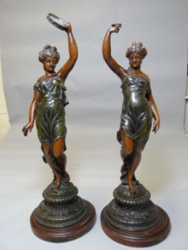A pair of early twentieth century spelter musician figures on circular wooden bases, 18.5 ins high (47 cms)