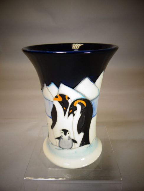A Moorcroft pottery 'Penguins Family on Ice' flared neck vase, 6 ins high (16 cms)