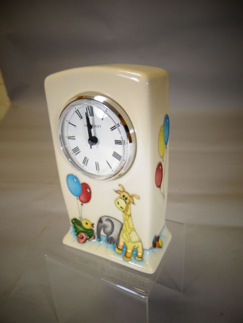 A Moorcroft pottery nursery clock decorated with children's toys and balloons