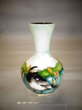 A Moorcroft pottery onion shaped vase in the 'Pied Wagtail' pattern, 7 ins high (18 cms)